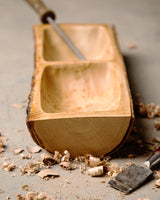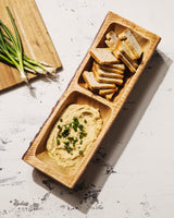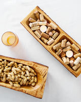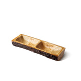 Inspire the feeling of the outdoors with this one-of-a-kind wooden serving tray. This piece is hand-carved from reclaimed wood with exposed bark edges to keep true to it's natural beauty. It's two sections make it perfect for pairings: hummus and pita, nuts and berries or keys and coins.